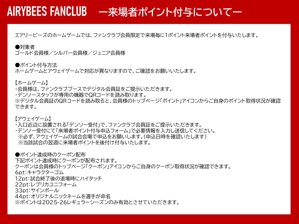 2025-26シーズンの『エアリービーズファンクラブ』の概要が決定しましたのでお知らせいたします。