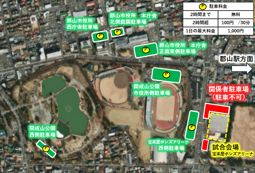 下記の案内図をご参照いただき、周辺駐車場のご利用をお願いいたします。また、周辺道路の混雑も予想されますので、可能な限り公共交通機関等でのご来場のご協力をお願いいたします。