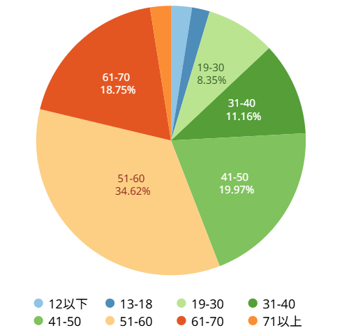 また、男女比は約7:3で男性が多く、年代では50代が最も多い構成となっております。